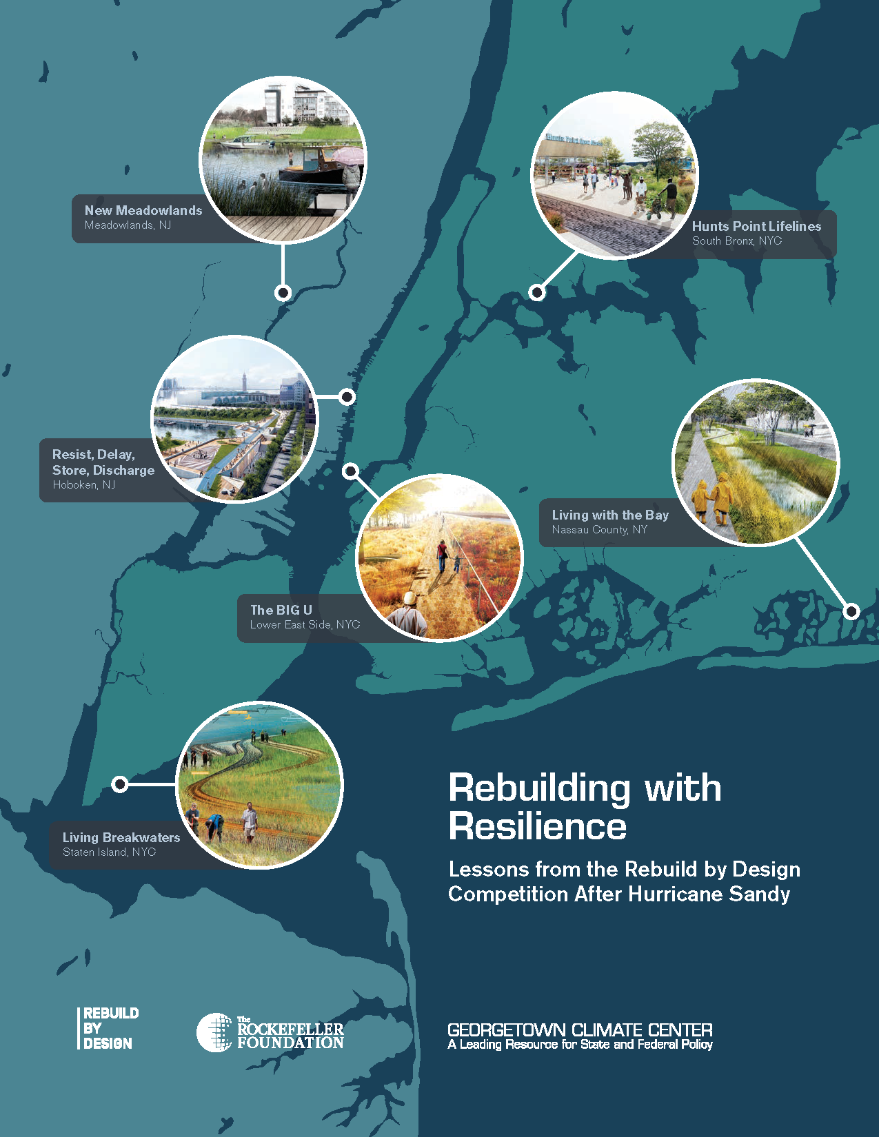 As these projects move from conceptual designs to physical projects, The Rockefeller Foundation, Rebuild by Design and the Georgetown Climate Center collaborated on a report — Rebuilding with Resilience — to capture the policy lessons that are being learned throughout the region. These projects provide important lessons about how officials at all levels of government can design and construct infrastructure projects that deliver multiple community benefits and enhance a community’s physical, economic, social, and environmental resilience.